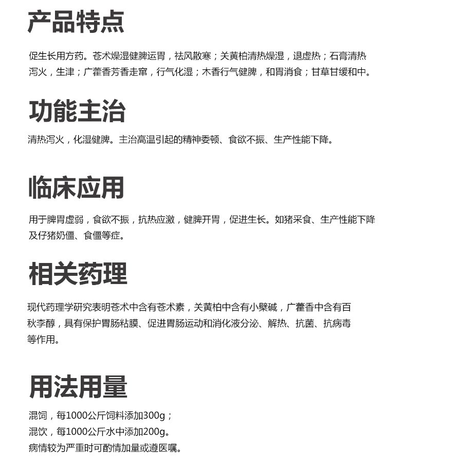 清熱瀉火,化濕健脾。主治高溫引起的精神委頓、食欲不振、生產(chǎn)性能下降。