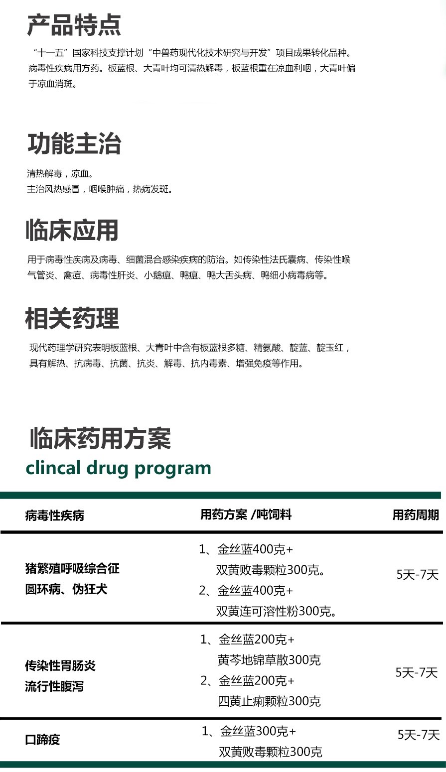 “十一五”國(guó)家科技支撐計(jì)劃“中獸藥現(xiàn)代化技 術(shù)研究與開發(fā)”項(xiàng)目成果轉(zhuǎn)化品種。 病毒性疾病用方藥。