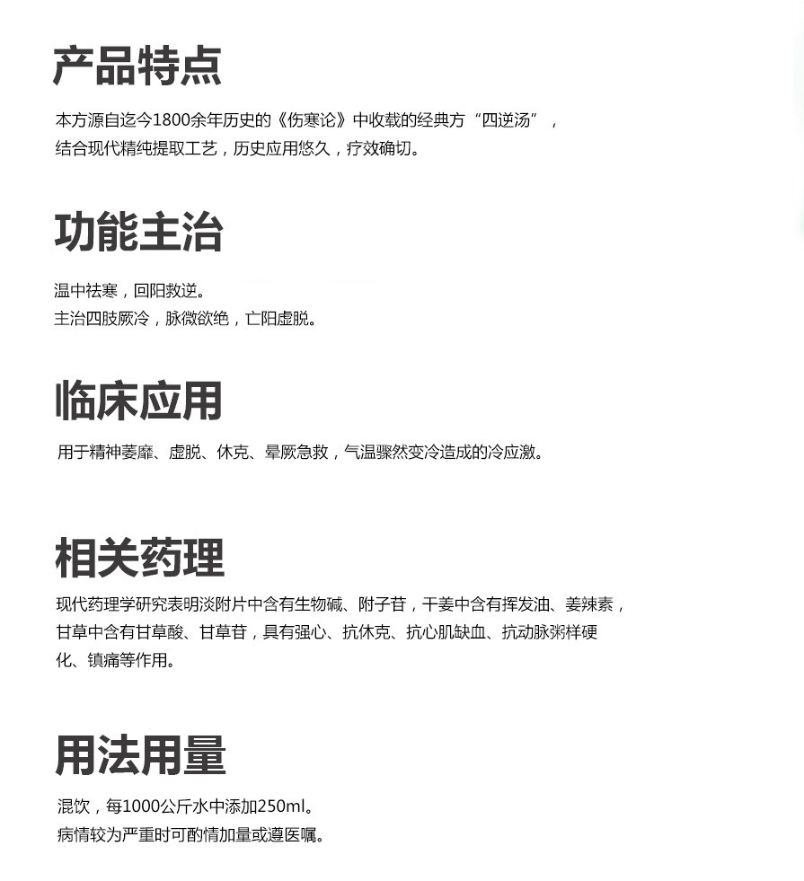 本方源自迄今1800余年歷史的《傷寒論》中收載的經(jīng)典方 “四逆湯”,結(jié)合現(xiàn)代精純提取工藝,歷史應(yīng)用悠久,療效確切。