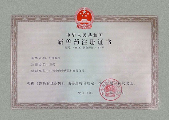 | 我公司自主研發(fā)的“護肝顆粒”順利獲得國家三類新獸藥證書 |