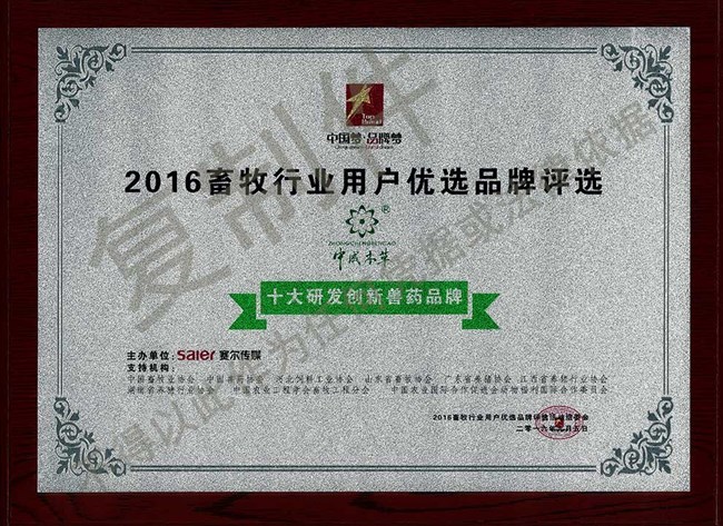 2016年9月5日,2016畜牧行業(yè)用戶優(yōu)選品牌評選結(jié)果揭曉,江西中成中藥原料有限公司的“中成本草”榮獲“十大研發(fā)創(chuàng)新獸藥品牌”。
